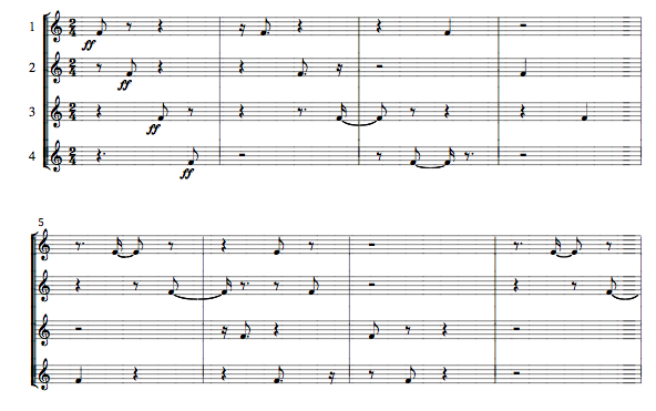 The metal pipes depart from the woodblocks of the first movement in that they are tuned to specific pitches:  F, Ab, C, Db, F, G, Ab.  Each musician has the same pitches in the same register.  They all play the same material, but in a constantly shifting series of four part canons that strain the capacity of the performers.